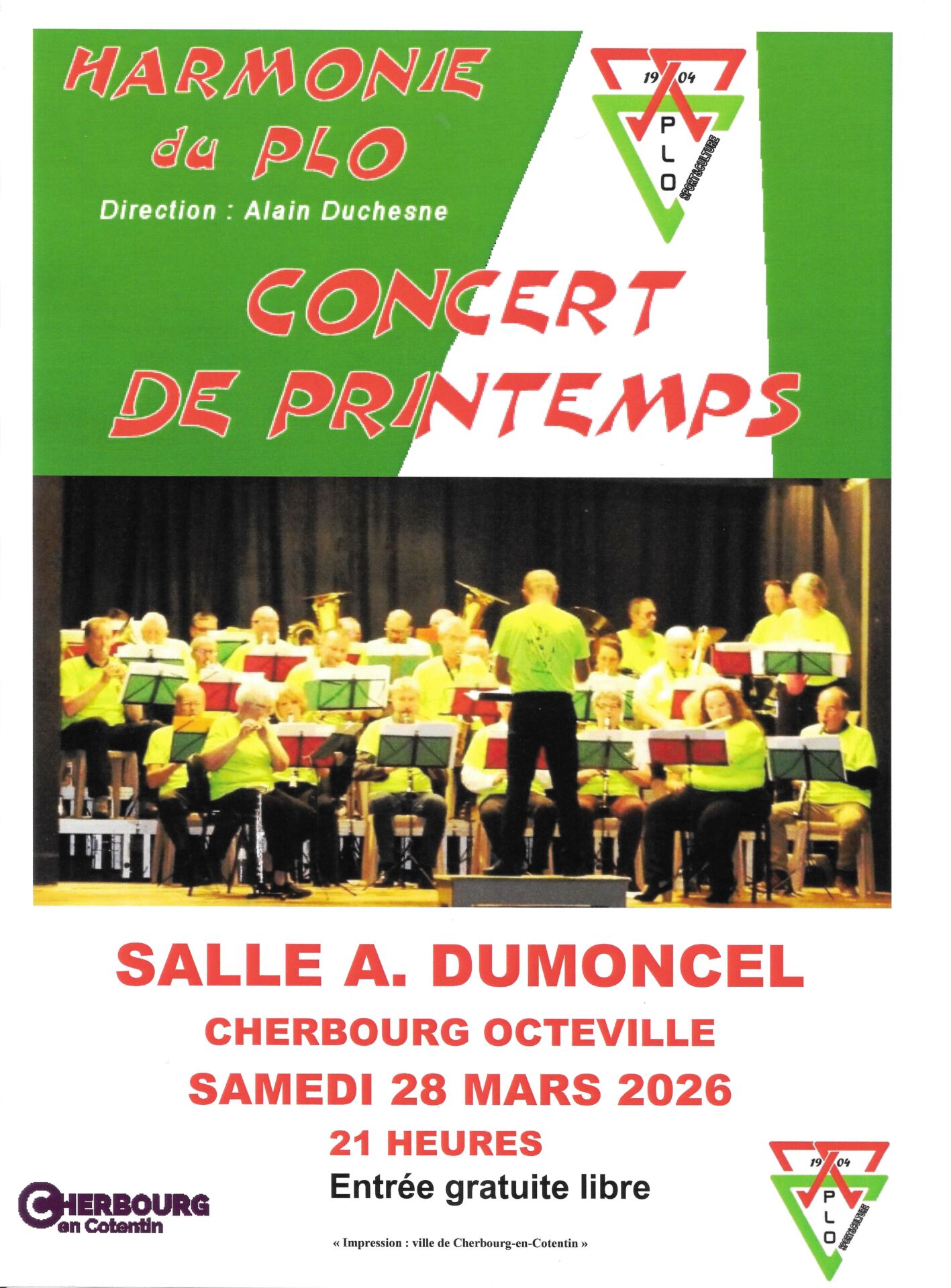 L’harmonie du PLO vous propose son concert de printemps le samedi 28 mars 2026 à 21h00 au siège du club, 105 rue Jacques Prévert à Octeville